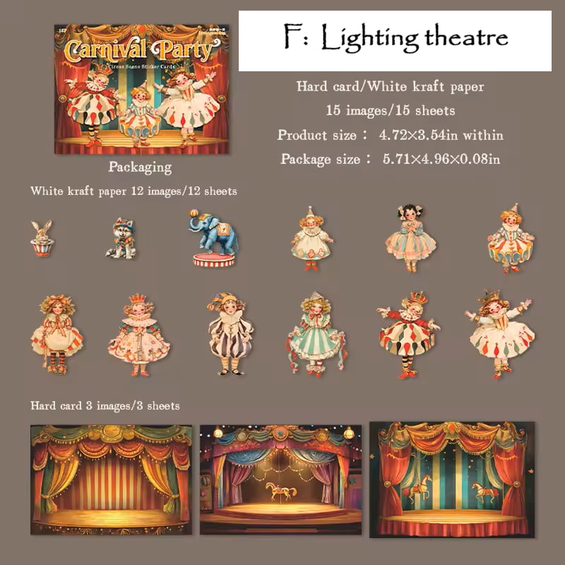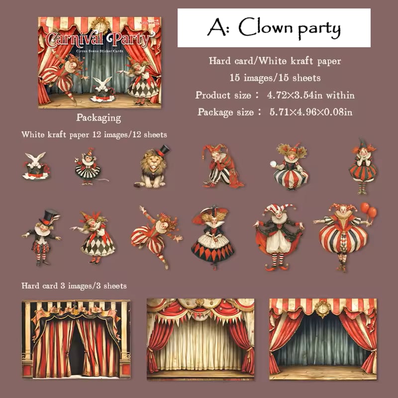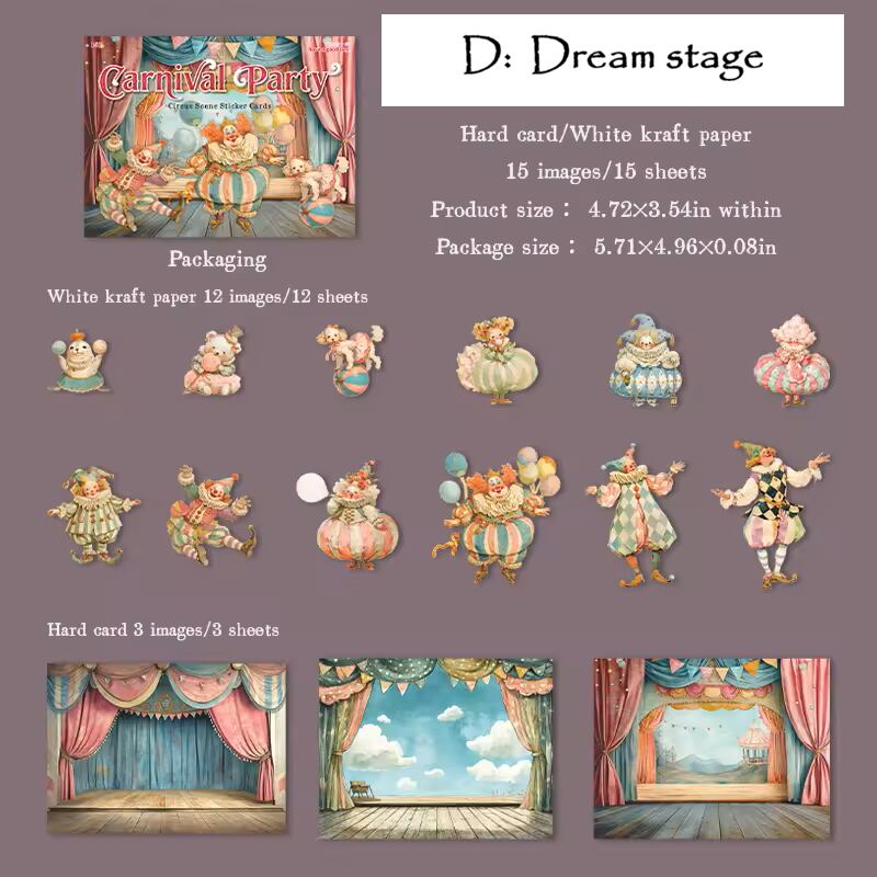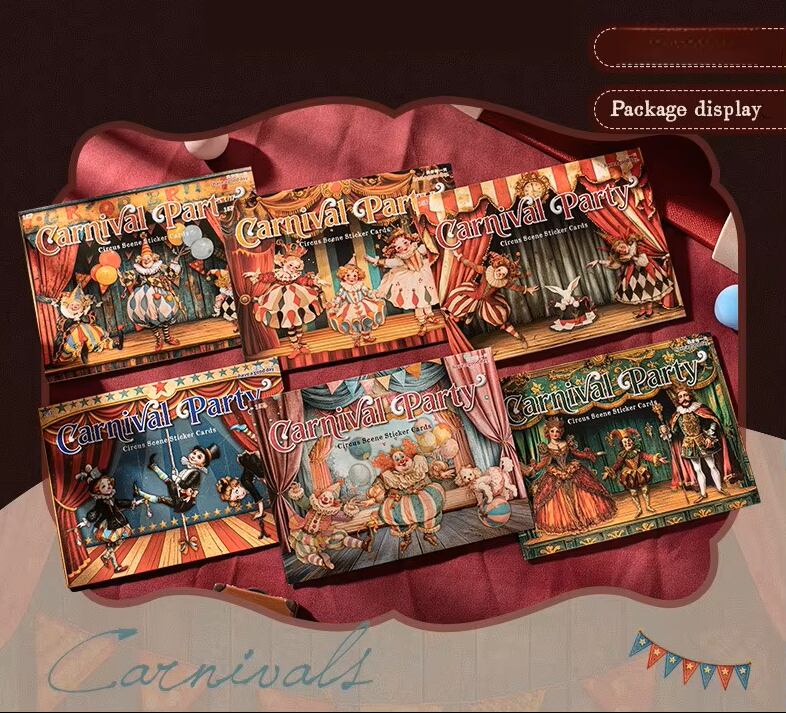 ピエロや動物たちのシールと、背景紙がセットになっており、貼るだけで物語のワンシーンのようなコラージュが完成します。