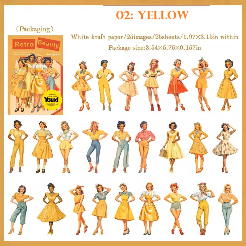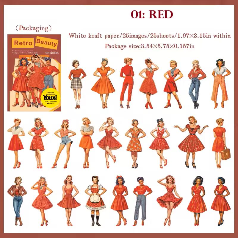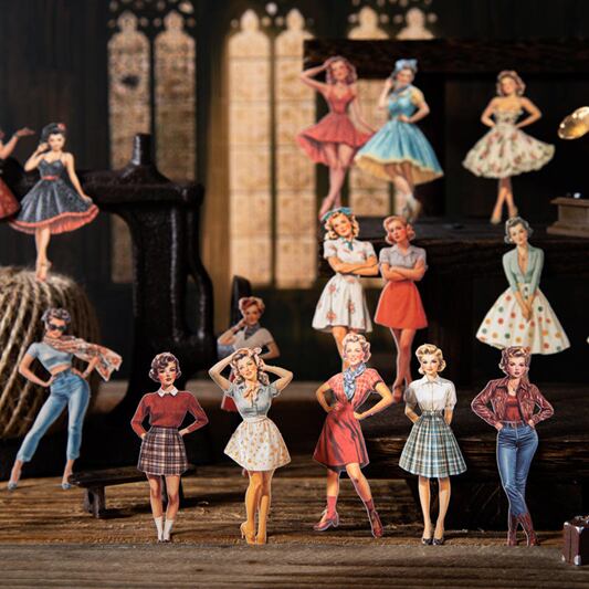 1950年代のアメリカンヴィンテージを彷彿とさせる、キュートで華やかなピンナップガール風の人物シール。